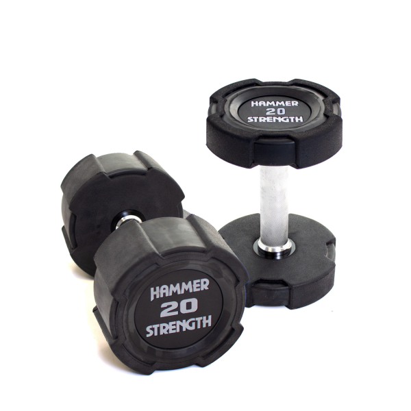 Гантель Hammer Strength уретанова 20 кг відрізняються чудовою міцністю завдяки подвійному або потрійному замку, надійно закріпленій системі кріплення голови до ручки. Антипрокатні головки, компактний дизайн та тверді хромовані рукоятки роблять їх зручними у використанні та керуванні. Високоякісний уретан забезпечує чудову стійкість до подряпин, порізів, стирання та загального зносу з часом, захищає обладнання від пошкоджень і забезпечує тривалу експлуатацію, а насічки на ручці сприяють впевненому хвату навіть без рукавичок. Завдяки компактним розмірам, гантель легко транспортувати та зберігати. Цільна конструкція зі сталі, диски товщиною 8 мм та ергономічна ручка роблять ці гантелі ідеальними для домашніх і професійних занять.