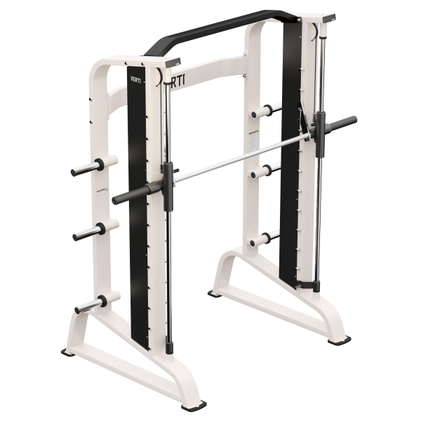 Гриф снабжен страховочными крюками-зацепами, обеспечивающими безопасность. Наличие штырей для дисков придает дополнительное удобство во время тренировки. По универсальности «Машина Смита» является достаточно привлекательным тренажером. Приставив регулируемую скамейку, на этом тренажере достаточно комфортно возможно выполнение различных жимов на мышцы груди и верхнего плечевого пояса.