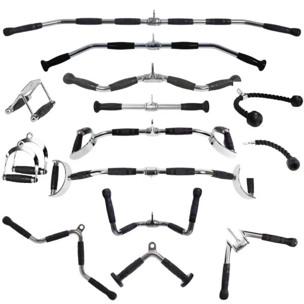 Комплект містить різноманітні типи ручок, такі як ручки для тяги з гумовими рукоятками, канати для тяги з різними хватами та конфігураціями, а також спеціальні ручки для верхньої тяги. Кожен з цих елементів розширює можливості вашого тренування та дозволяє вам ефективно працювати над різними м'язовими групами.