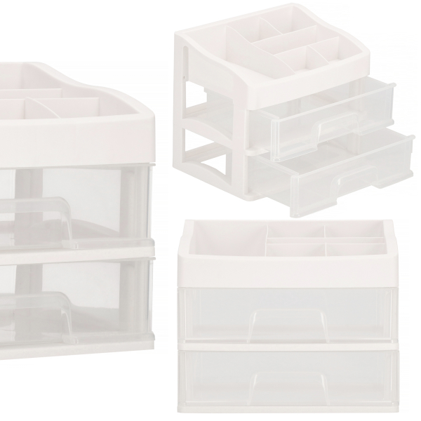 Органайзер від Springos виготовлений із щільного пластику та має цілих 6 відділень різного розміру у верхній секції та 2 висувних ящики. Найменші короби можна використовувати для зберігання дрібних предметів, таких як сережки, кільця, лак для нігтів або скріпки. У висувні ящики легко помістяться засоби гігієни та інші аксесуари. Сучасне пристосування виконує не тільки практичні, а також естетичні функції. Органайзер стане прикрасою та родзинкою будь-якого туалетного столика завдяки стильному вигляду та привабливому дизайну. Він дуже легко чиститься і миється універсальними миючими засобами, що дозволяє утримувати його в чистоті.