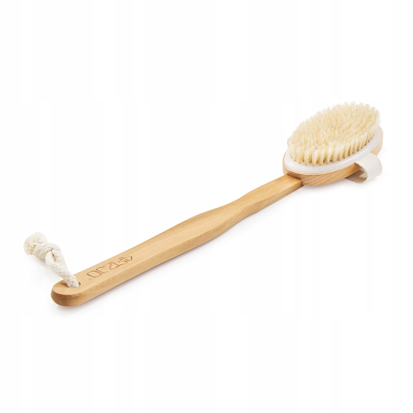 Масажна щітка для тіла від 4FIZJO має знімну ручку, завдяки якій легко масажувати всю спину. Також можна використовувати щітку під час купання. Завдяки спеціально розробленому вирізу, ручка надійно утримується на місці й може бути від'єднана одним рухом. Овальна форма - найпопулярніший дизайн. Щітка має товстий бавовняний ремінець, який забезпечує надійне захоплення та дозволяє зручно розтирати все тіло. У цій моделі виробник використав щетину середньої жорсткості. Завдяки цьому, вона підійде як людям, які тільки починають працювати з сухою щіткою, так і тим, хто регулярно проводить самомасаж тіла. Важливий плюс виробу - щітка не потребує складного догляду. Щоб вона якомога довше залишалася в ідеальному стані, протирайте щетинки рукою після кожного використання для запобігання скупченню омертвілої шкіри. Рекомендується раз на тиждень вимити щітку з милом, а потім ополоснути її водою і дати висохнути природним шляхом щетиною вниз. Масажні щітки не можна сушити на батареї. Зберігати виріб необхідно у сухому місці, де немає вологи.