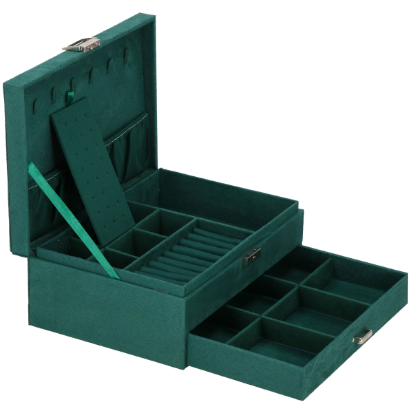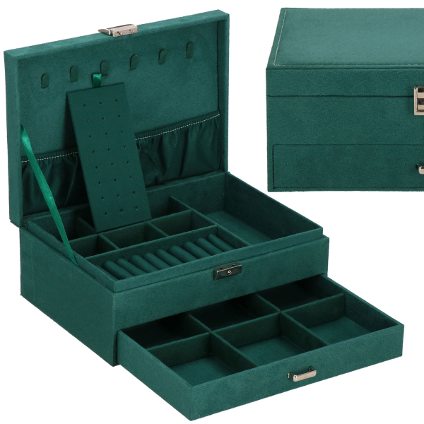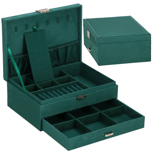 Скринька для прикрас бренду Springos має верхнє відділення, а також висувну шухляду. Вони розділені на кілька секцій для кілець, сережок, підвісок та інших аксесуарів. Внутрішній матеріал оббивки - велюр, є повністю безпечним для ювелірних виробів, підкреслює їх цінність, а на додачу приємний на дотик. Компактний розмір та продумана ергономіка роблять органайзер незамінним для подорожей.
